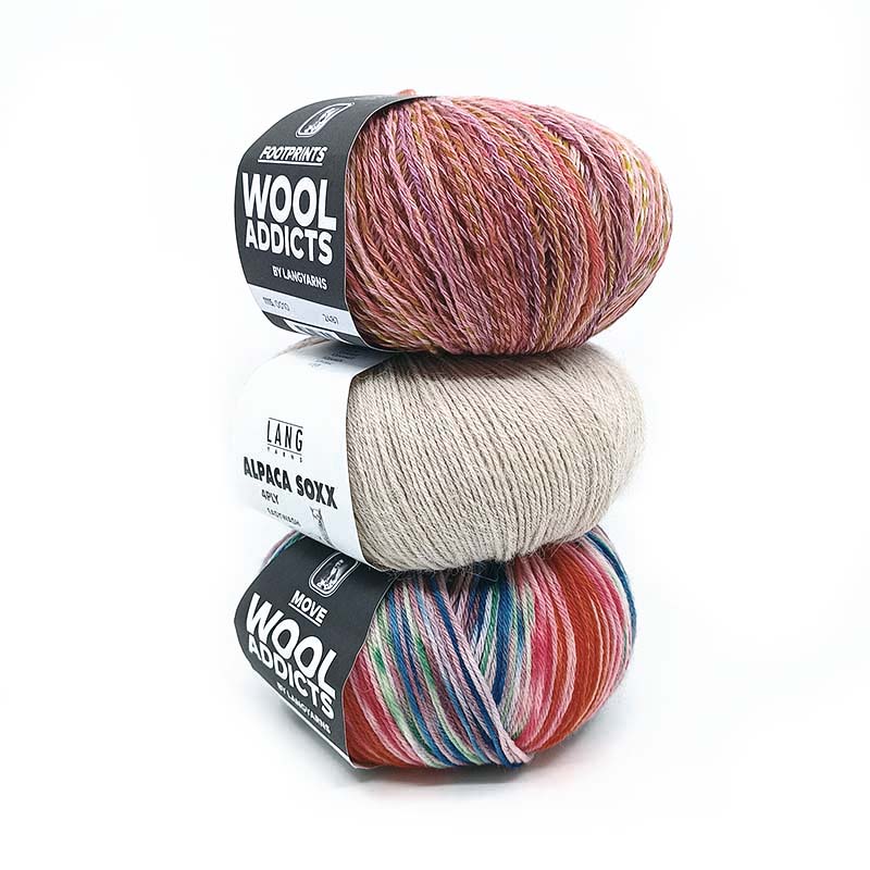 Met dit actie pakket breng je niet alleen kleur in je assortiment sokken, maar kun je sokken voor iedere tijd van het jaar breien. In de set zit 1 bol Lang Yarns Alpaca Soxx 4 ply (70% Alpaca super fijn en 30% polyamide), 1 bol Wooladdicts Move (75% merino wol en 25% polyamide) en 1 bol Wooladdicts Footprints (45% katoen, 42% superwash wol en 13% polyamide).
