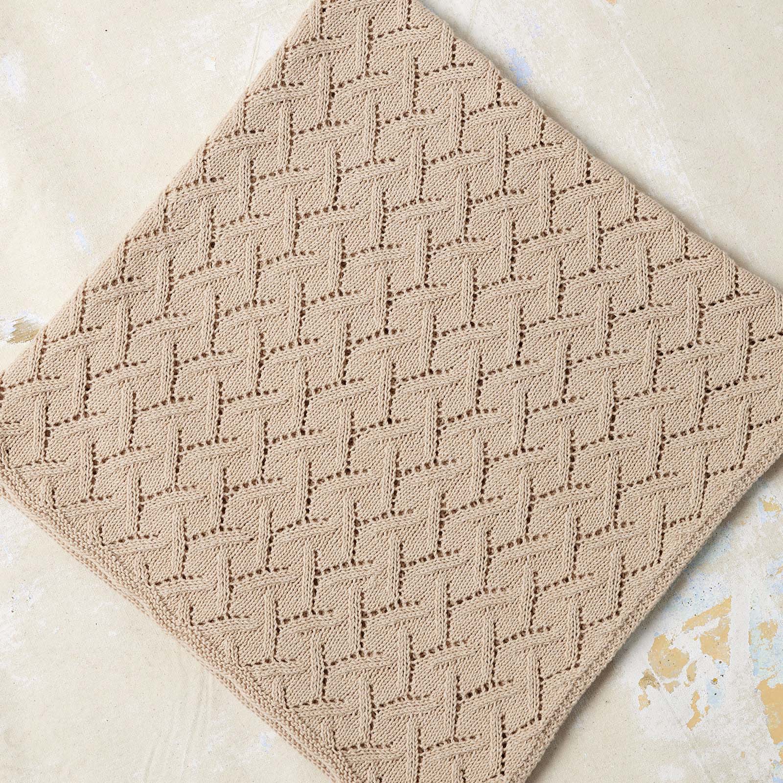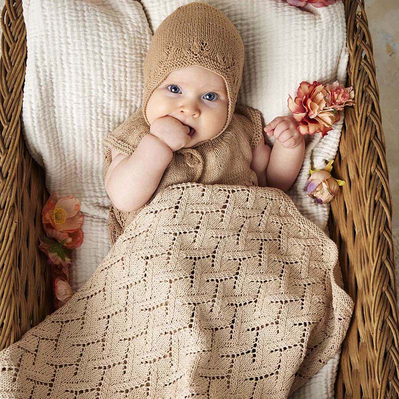 Babydeken Edda heeft een romantisch ajourmotief waardoor het een leuk en afwisselnd project is om te breien. Het wordt gebreid met een ongeverfd, biologisch katoen garen en is daarom perfect om voor de baby te gebruiken.