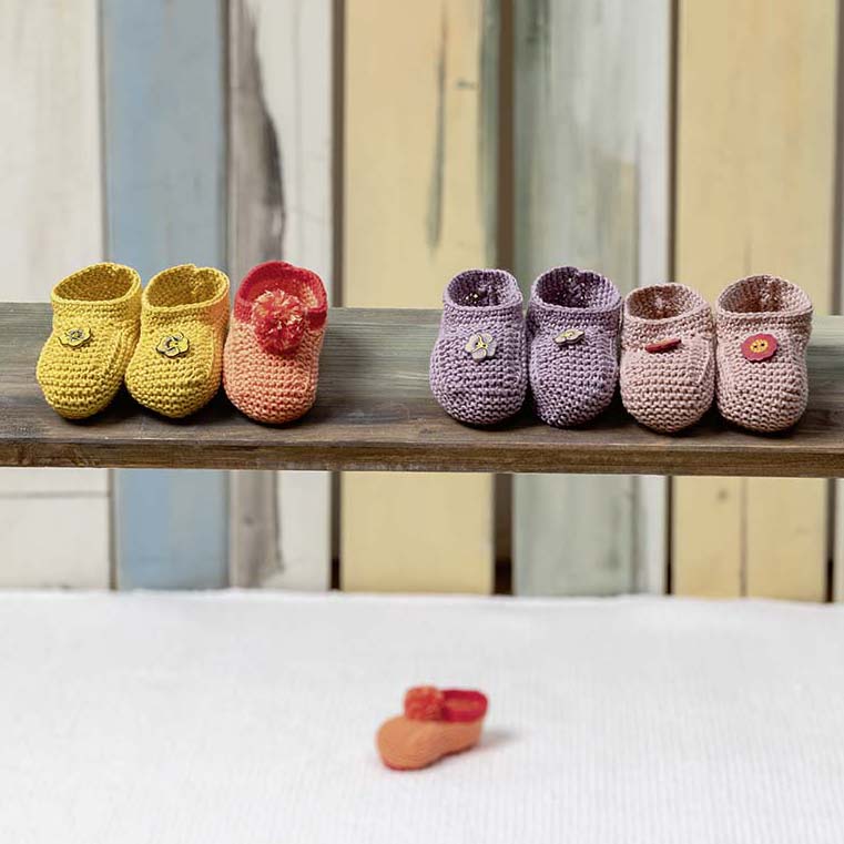 Deze baby van katoen zijn eenvoudig om te breien en leuk om in verschillende kleurtjes te maken. Je breit ze in ribbelsteek en kunt ze daarna versieren met een pomponnetje, een gehaakt bloemetje of je maar leuk vindt. Per paar heb je maar 1 bolletje Lang Yarns Baby Cotton nodig.