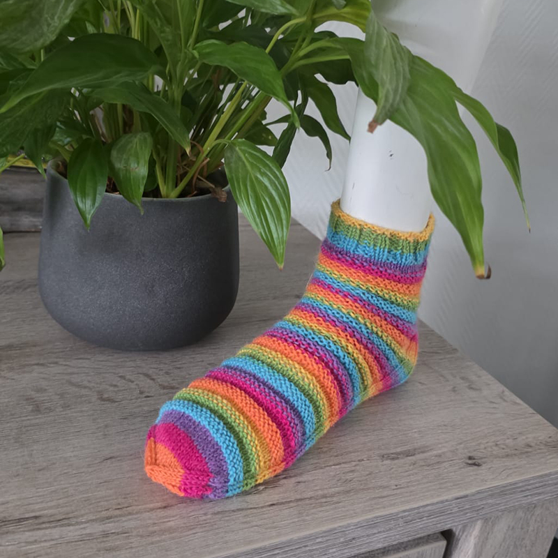 Je vrebruikt net zoveel garen als je voor gewoone sokken gebruikt.