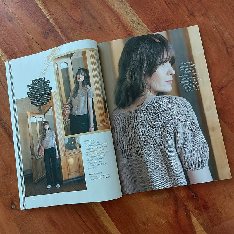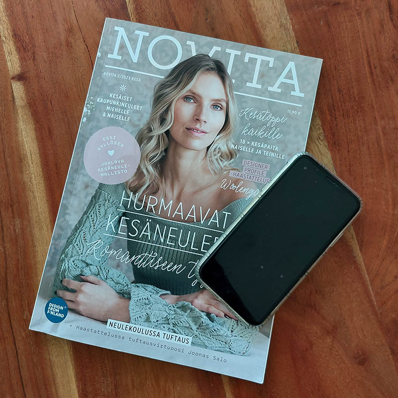 Om je uit te leggen hoe je eenvoudig zelf een breipatroon kan vertalen, nemen we een van onze mooie Finse patroonboeken van het duurzame merk Novita. We pakken de mobile telefoon erbij en kiezen het patroon van het korte mouwen vestje.