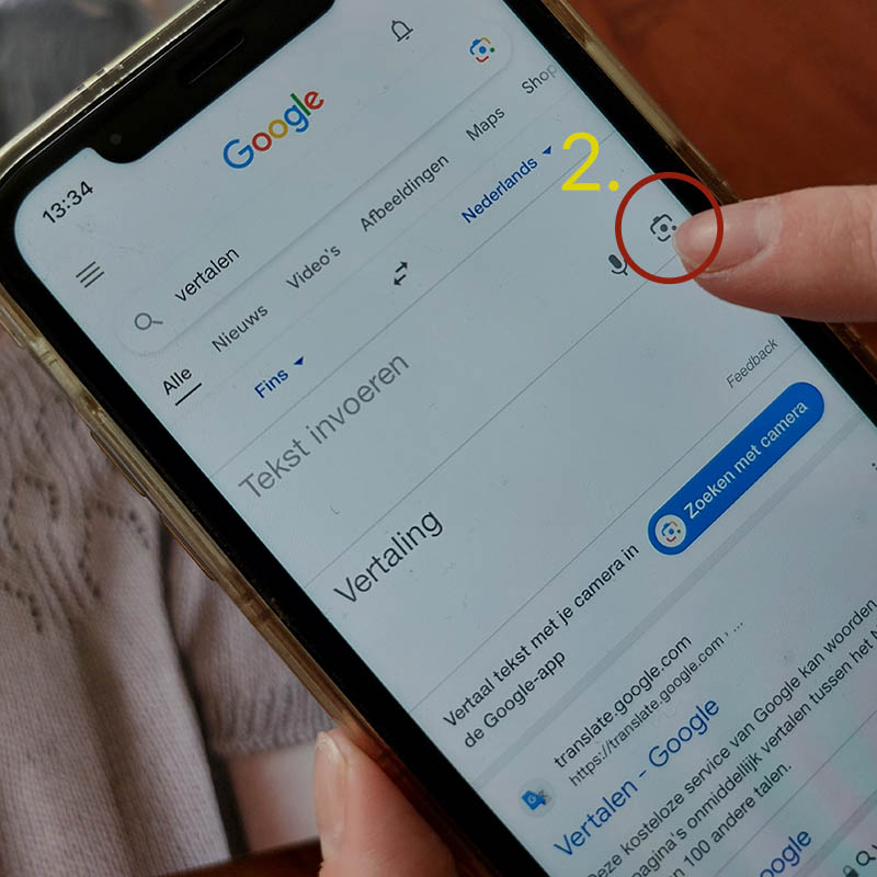 Als het goed is toont Google direct haar eigen vertaal programma. Kies de taal waarin je patroon is geschreven en kies Nederlands om naar te vertalen (1). Tik daarna op het fototoestel icoontje (2).
