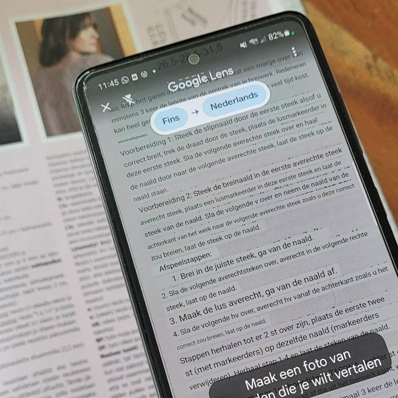 Richt het scherm van je mobiel op de tekst die je wil vertalen. Dat werkt het beste als je je scherm er recht boven houdt. 'Google Vertalen' gaat aan het werk en automatisch verschijnt de tekst van het patroon in het Nederlands. Simpel toch?!