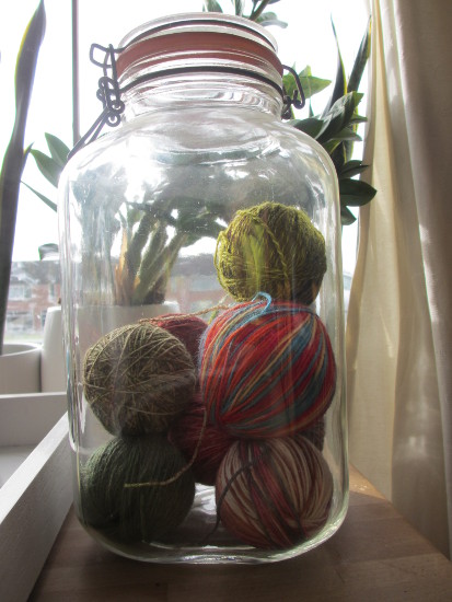 Als de sokken af zijn hou ik altijd een hoop garen over maar het is nooit genoeg voor nog een paar sokken voor mezelf en het is zonde om weg te gooien. Daarom ben ik begonnen met alle restjes op te sparen. Ik wikkel ze op tot kleine bollen en gooi ze in een grote pot. Dat is niet mijn eigen idee hoor. Ik zag het ooit op een breiblog en ik vond het zo’n leuk idee! Mijn pot met bollen: