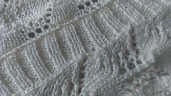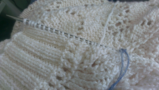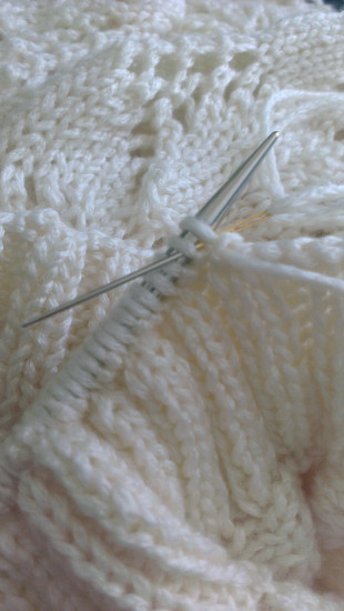 Gelukkig had mijn patroon medelijden met me en zei dat het boord in twee gedeeltes gedaan kan worden door steeds de helft van de steken op te nemen en te breien en daarna middenachter de twee boorden aan elkaar te naaien. Kijk, daar wordt het al wat overzichtelijker van.