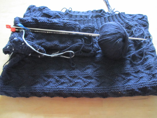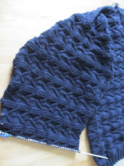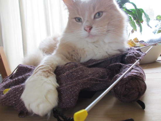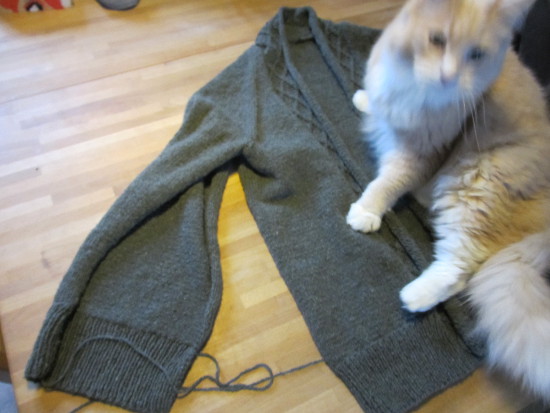 Nog een ergenis. Het garen, Superlana – Lana Grossa, is geweldig en de kleur is prachtig (ik heb moeite het goed op de foto te krijgen maar het is heel mooi donkerblauw) maar ik heb ook een kat. Een hele grote langharige zalmkleurige kat. Donkerblauwe wol + lichtharige kat = constant kattenharen op mijn breiwerk. Ik zit de hele dag haren eraf te plukken. Voor elke Harriehaar die ik eraf pluk verschijnen er gelijk 3 nieuwe. Breien en katten is sowieso een moeilijke combinatie. Ik heb op de harde manier geleerd mijn breiwerkjes en wolletjes op te bergen als ik er klaar mee ben. Alles buiten kattenbereik want als ik het niet doe en ik wil mijn projectje oppakken om verder te breien dan kan ik je garanderen dat er een dikzakkat op ligt te verharen.