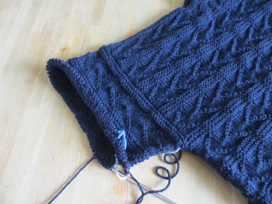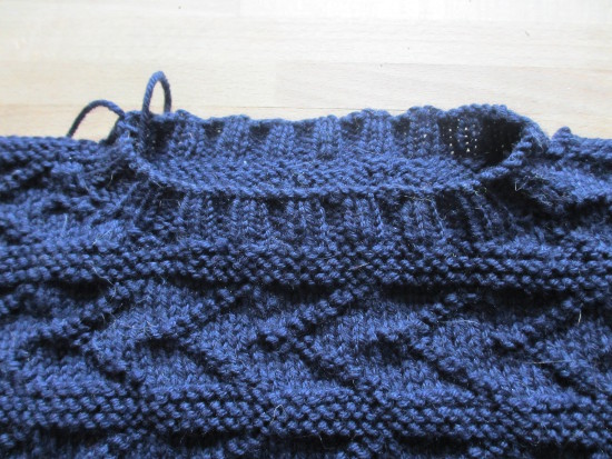 Het opnemen van steken is niet mijn favoriete gedeelte van breien en mijn trui was nu zo ver gevorderd dat ik heel wat steekjes voor de boeg had. Eerst voor het halsboord. Dat had een aantal valse starts en duurde veel langer dan nodig was maar uiteindelijk heb ik er een redelijke hals ingekregen. Hij is wel veel korter geworden dan het patroon zegt en dat komt omdat het breien daarvan nogal moeizaam ging. Ik was het na een pen of 8 zat dus heb ik de creatieve vrijheid genomen om er een eind aan te breien (letterlijk). Hoewel ik de steken zo los mogelijk heb afgekant is de hals toch vrij strak. Mijn hoofd past erdoorheen maar ik ben bang dat dat toch een zwakke plek gaat worden en het misschien wel ooit kapot zal breken. Als de trui helemaal af is ga ik het afkanten nog een keer opnieuw doen met een hopelijk wat flexibeler resultaat.