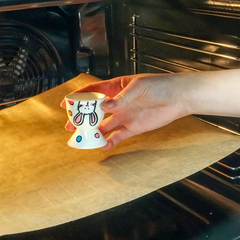 Laat de decoraties 15 minuten drogen en verwarm de oven voor op 160 graden. Ze de eierdopje op een bakpapier, op een koud rooster in het midden van de oven en bak ze 25 minuten om de afbeelding te fixeren. Laat de eierdopjes afkoelen in de oven. Als ze helemaal klaar zijn kun je ze gewoon in de afwasmachine wassen.