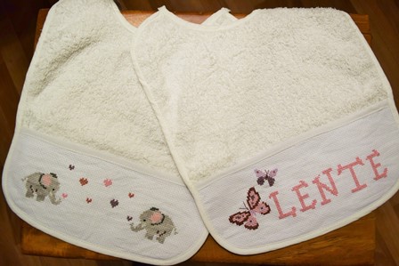 Mijn collega is alweer enkele weken de trotse moeder van een prachtige dochter! En dat vroeg om een mooi kraamcadeautje. Iets zelf maken blijft toch het leukst. Dus borduurde ik twee vrolijke slabbetjes. De een met haar naam en twee vlinders, de ander twee olifantjes met hartjes. Erg leuk om te doen en nog leuker om te geven.
