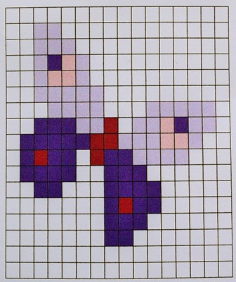 - DMC borduurzijde zacht grijs, donker grijs, zwart, roze en wit (dat zijn de puntjes in de tel tekening)