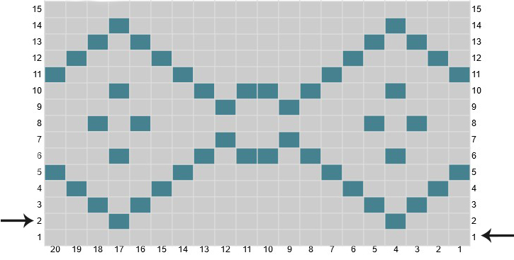 Je leest het telpatroon, zoals je breit. Dus bij toer 1 staat een pijltje van rechts naar links. Dit is de heengaande toer aan de goede kant van je werk, welke je recht breit. Het pijltje bij toer 2, van links naar recht geeft de teruggaande toer aan, die je averecht breit en dus van links naar recht telt om goed in te breien.