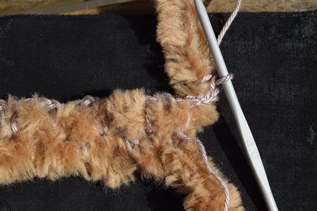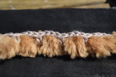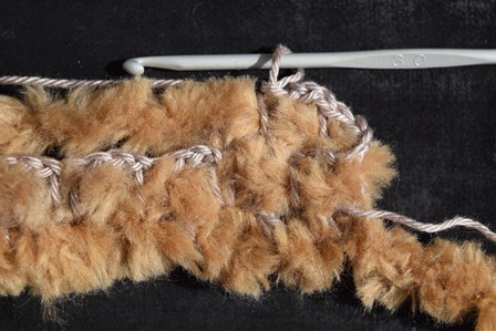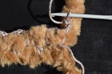 dan weer 3 losse en haak je weer om de Boreal draad, waarbij je dieper insteekt en onder de 3 losse van het 2e ‘vakje’ van de vorige toer door.