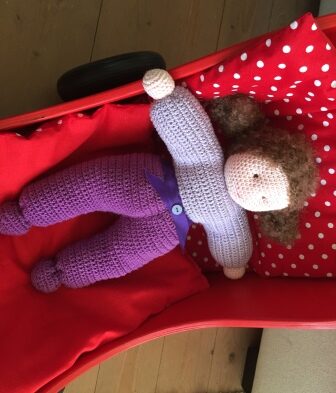 Nu leek het me leuk eens te proberen zo’n knuffelpopje te haken in plaats van te naaien. Geen idee hoe het effect zou zijn, maar wellicht de moeite waard het eens te proberen.