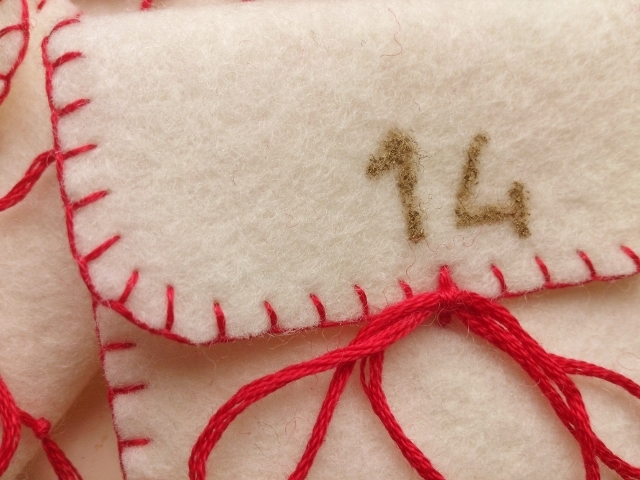 Om in de Kerst sfeer te komen had ik een Advent slinger gemaakt. Vierentwintig kleine zakjes van vilt die je aan een dikke wollen draad, een mooi sierlint of een mooie tak hangt.