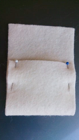 - Meet 11 cm van onderaf het strookje, vouw dat door midden (5.5 cm per stukje) en speld het aan beide zijde vast.