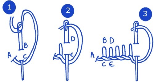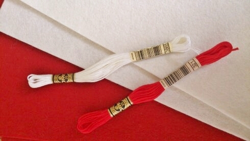 - Pak 2 draden DMC splitzijde en sluit de zijnaden met een festonsteek. Gebruik voor een mooi effect, bij het rode vilt, wit draad en bij het witte vilt rood draad. Bekijk het plaatje hieronder als je niet precies meer weet hoe de festonsteek moet.
