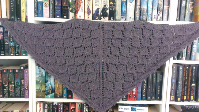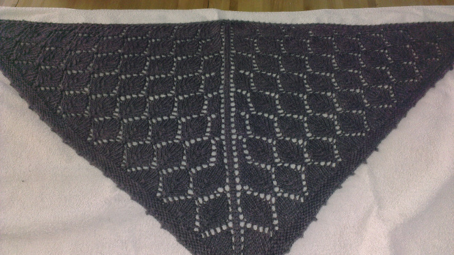 Wat heb je nodig: het patroon natuurlijk. Dat staat hier: The lonely Tree Shawl. Ik heb niet het aanbevolen garen gebruikt. Dat heb ik vervangen voor 4 bollen Phildar partner 6. Ik gebruikte de kleur paars/heide. En verder natuurlijk breinaalden. Ik gebruikte rondbreinaalden nummer 5.5. Gewone rechte naalden kan ook maar dan wordt het uiteindelijk wel dringen met al die steken op je pennen.