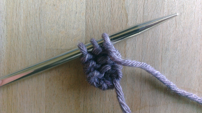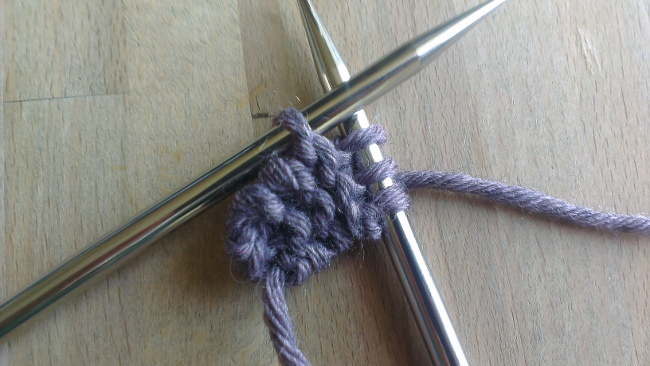 Neem 3 steken op van de lange kant van je breiwerkje en 2 steken van de onderkant: