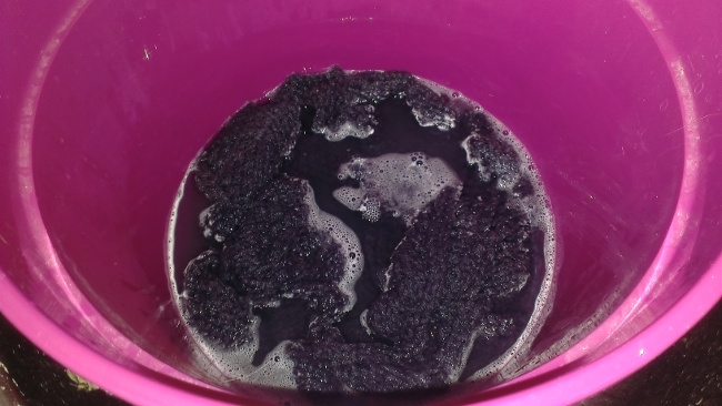 Hoera! Het breigedeelte is helemaal klaar. Nu het saaie gedeelte: de afwerking. Losse eindjes wegwerken (bah) en daar heb ik mijn breiwerk een half uurtje laten zwemmen in een emmertje met lauw water en een drupje wolwasmiddel.