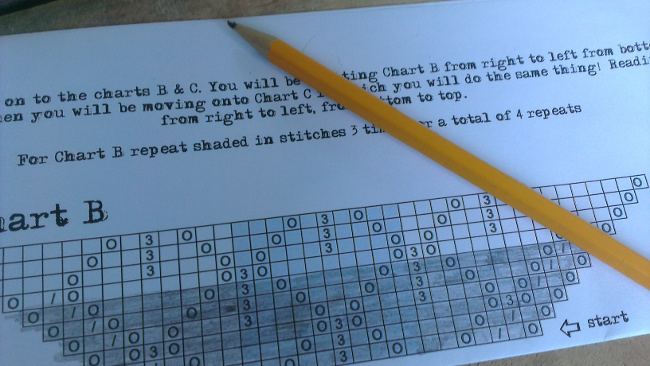 Nu brei je verder in ajoursteek volgens telpatroon A (Chart A) van het patroon.