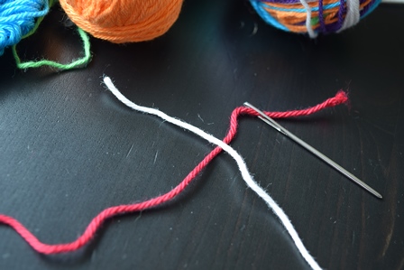 2. Leg de draden gekruist over elkaar en haal de draad door de naald.