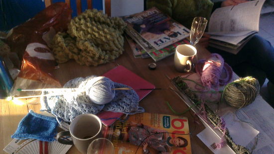 Zo gauw als ze binnenkomt, nog voor de eerste kop koffie gezet is, worden de breiwerken al uit haar tas getrokken. “Kijk, ik ben dit aan het maken…en dit. En daarna ga ik deze opzetten”. Een uur later ziet mijn eetafel eruit of er een breigarenfabriek op is ontploft.