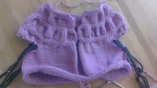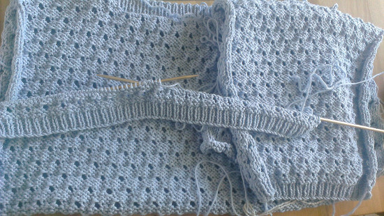 Het rugpand en één van de mouwen zijn af, het voorpand is opgezet. Ik maakte me een beetje zorgen of ik genoeg garen zou hebben maar van de 9 bollen heb ik er nog 5 over. Meer dan genoeg dus.