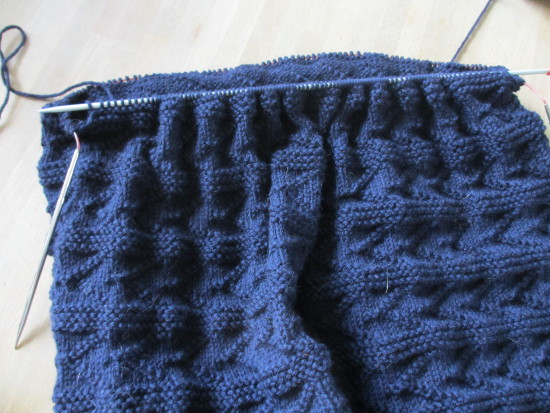 Visserstruien worden traditioneel in het rond gebreid tot aan de mouwsgaten. Het patroon voor deze trui zegt dat je 44-46 cm (inclusief boord) moet breien en dan moet het werk worden opgesplitst in tweeën, voorpand en achterpand. Deze panden worden los van elkaar heen en weer gebreid op gewone rechte naalden met knop. Ik had 208 steken opgezet en dat delen door 2 is 104 steken per naald. Dan ziet je breiwerk er zo uit: