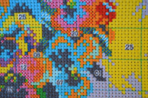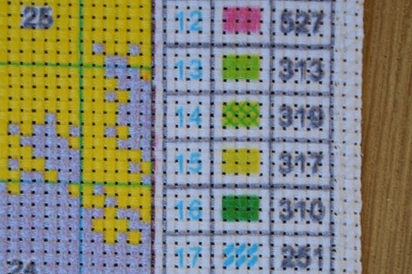 Zo blijft het goed zichtbaar wat je moet borduren, ook als er kleine kleurverschillen zijn. In iedere kleur staat nog eens extra het kleurnummer gedrukt.