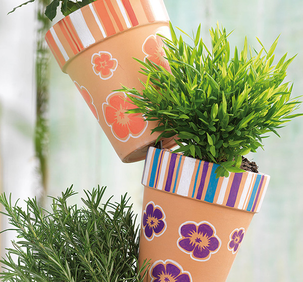 1. Decoreer de bloempotten en plant jouw favoriete bloemen of kruiden in de potten.