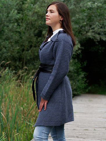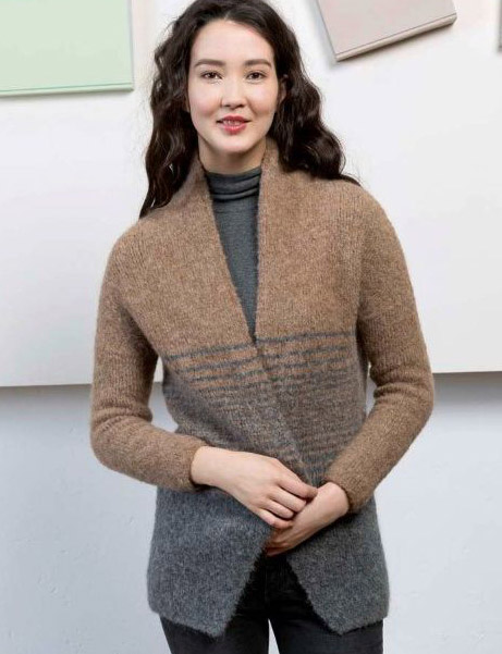 Dit fijne lange vest wordt met drie draden gebreid, op breinaalden 8 en 10.