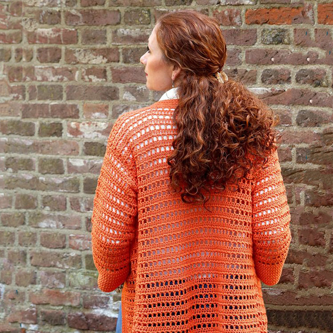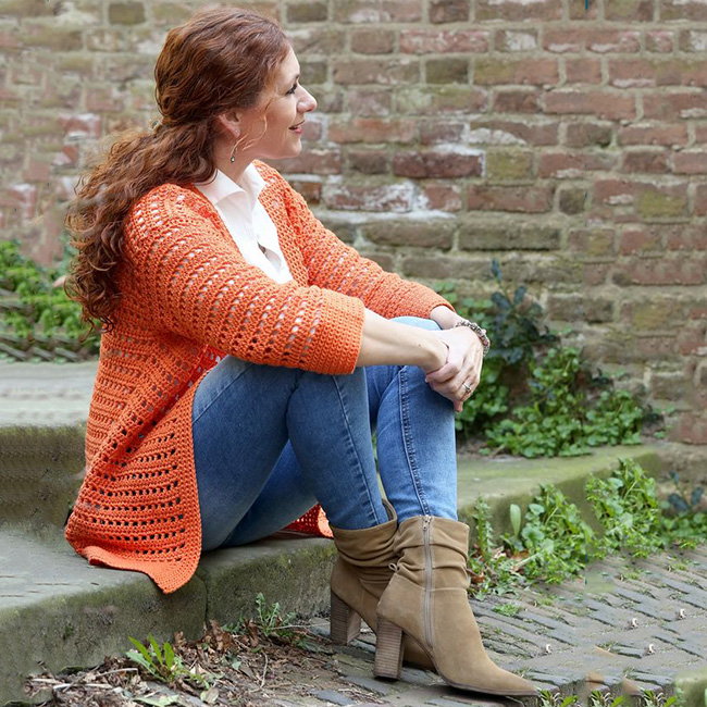 Je haakt het met een speciaal garen, Lang Yarns Divina. Een ketting garen met een mix van katoen met zijde en modal. Hierdoor voel het zacht aan en valt het damesvest mooi soepel.