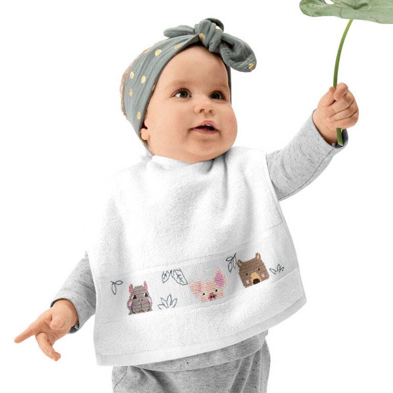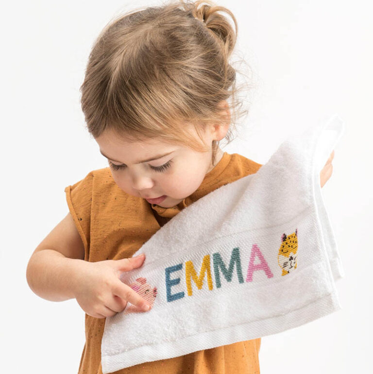 Je kunt kiezen uit verschillende maten handdoek met bijpassende washandjes. De handdoeken en washandjes hebben net als de slabbetjes een aïda borduurrand waarop je makkelijk met kruissteek borduurt.