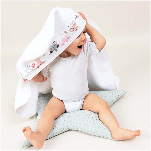 Om nog even in de praktisch hoek te blijven is het borduren van een baby badcape of baby omslagdoek ook erg leuk. Het is heerlijk om de kleine uit bad in te wikkelen.