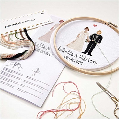 Het borduurpakket biedt een selectie van verschillende kleuren garens in huidskleuren, haarkleuren en kledingtonen, zodat je het bruidspaar precies zo kunt weergeven als jij ze in gedachten hebt. Je kunt ook kiezen om een vrouwelijk of mannelijk koppel te borduren. Deze veelzijdigheid maakt het een ideaal cadeau voor elk getrouwd paar.