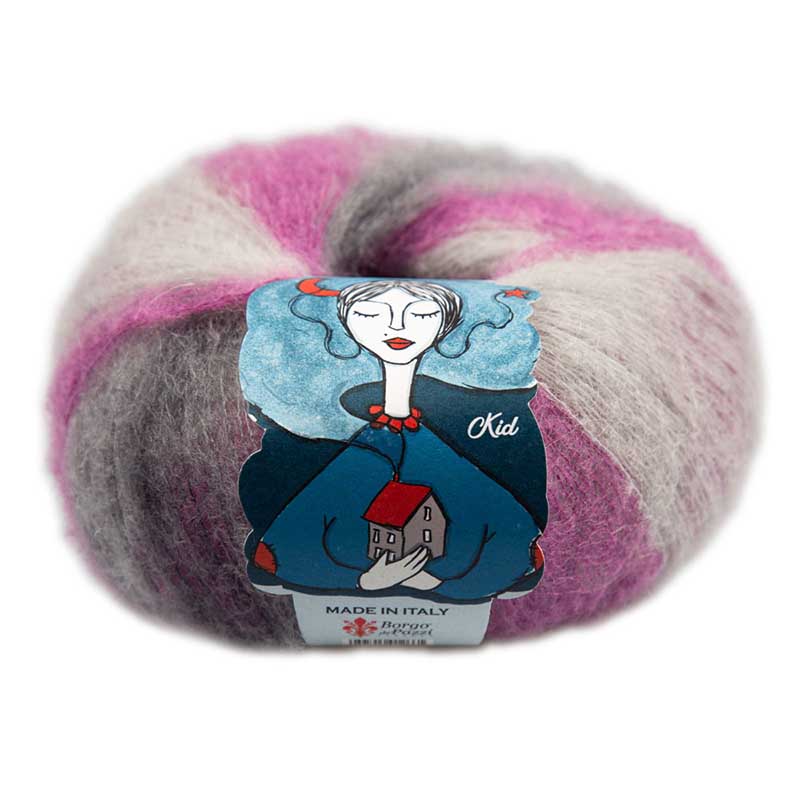 Borgo de Pazzi Kid Mohair is een prachtig mohair garen met een mooi kleurverloop. Een lekker licht garen dat je zowel met enkele draad als met meerdere draden tegelijk kunt breien of haken. Je kunt het zelfs met een effen kleur van een ander type garen combineren. Zo krijg je een dichtere structuur met het pluizige effect en een mooie kleuren melange.