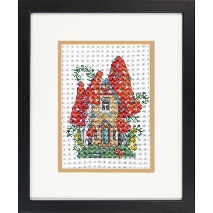 Dit sfeervolle kruissteekpakket Bos huisje van Dimensions Needlecraft brengt je meteen in een rustige, sprookjesachtige bosomgeving. Het ontwerp toont een knus huisje tussen grote paddenstoelen en heeft een warme, natuurlijke sfeer. Met een formaat van circa 14 x 19 cm is dit een fijn, overzichtelijk borduurproject dar perfect voor tussendoor of als subtiele decoratie in huis.
