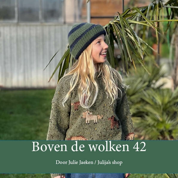 In Boven de wolken 42 staan 10 breipatronen voor kinderen. Een mix van 5 gloednieuwe ontwerpen en de persoonlijke favorieten van ontwerpster Julie Jaeken met schattige diertjes. Naast de patronen bevat dit nummer ook een uitgebreide fotohandleiding waarin stap voor stap wordt uitegelegd hoe je kan mazen. Zo kunnen zowel beginners als ervaren breiers hun creaties een perfecte afwerking geven.