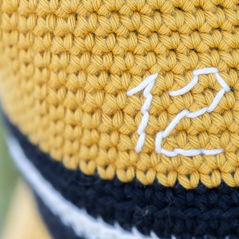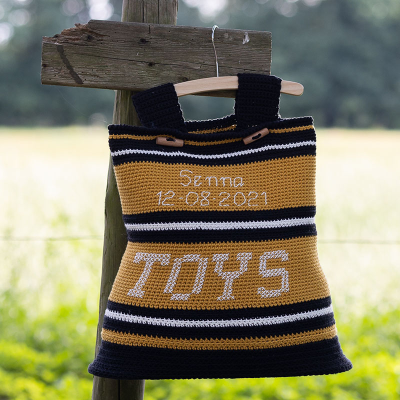 De boxzak Senna wordt gehaakt met het dikke garen Durable Double Four. Een stoer dik garen van 100% katoen. De tas wordt van onderaf aan een mfd bodem gehaakt zodat hij voldoende draagkracht heeft. Door deze wat vastere steek gaat de boxtas niet lubberen en voelt hij stevig aan. Ben je klaar dan kun je zelf kiezen of je er ook nog een naam op borduurt. In het magazine staat een alfabet patroon wat je daar voor kunt gebruiken.