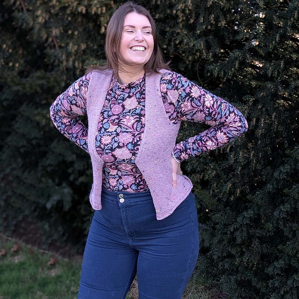 Het leuke dames gilet Coco past in iedere kledingkast. Je kunt het combineren met een blouse of shirt, op een broek of rok en draagt comfortabel. Je breit deze gilet met het vrolijke tweed garen Hedgehock Fibers Tweedy op naalden 3. Een handgeverfd garen van Falkland merino en gerecycelde wol.