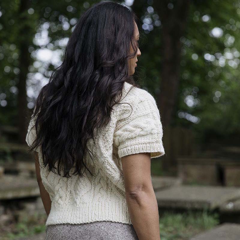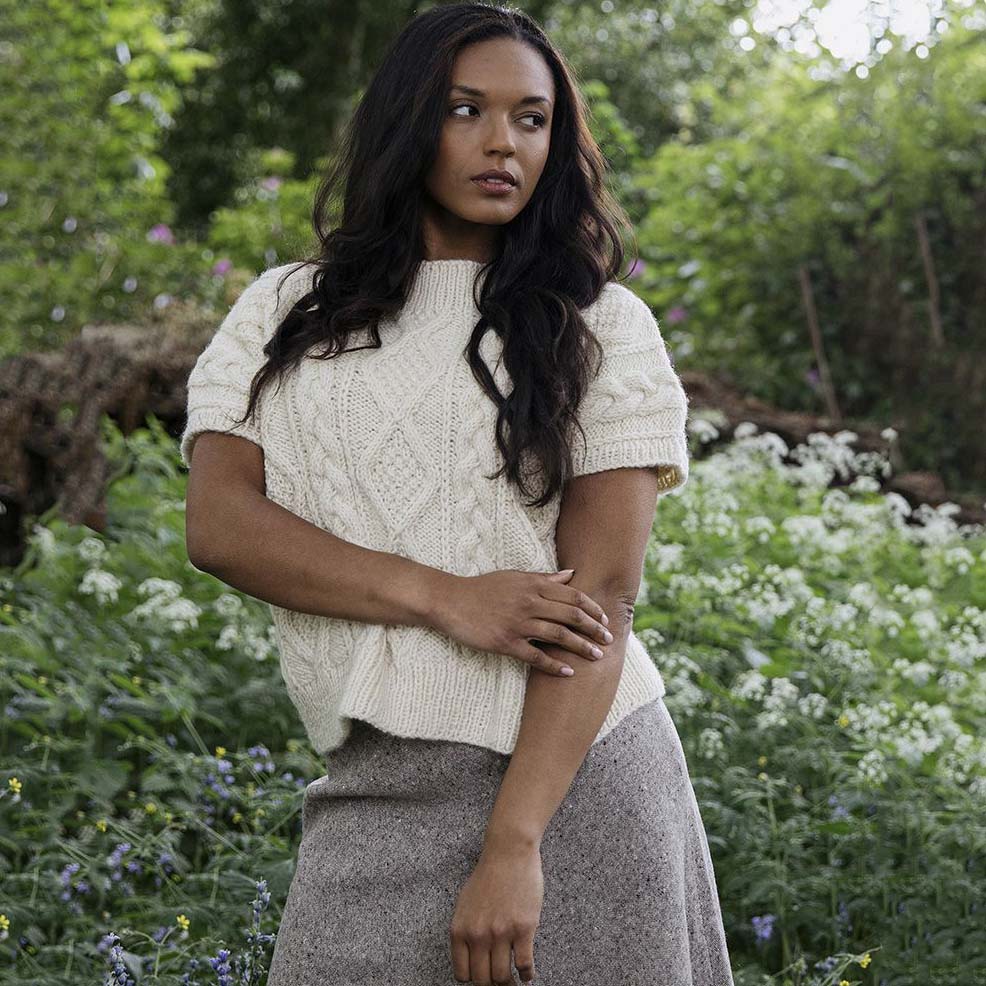 Dames spencer Dale heeft verschillende kabelpatronen die mooi tot zijn recht komen met dit zachte Novita garen. De spencer heeft korte, aan gebreide mouwtjes waardoor je het ook zo kunt dragen. Spencer Dale is verkrijgbaar vanaf maat S-M tot maat 3XL. Borstomtrek maat S-M = 112 cm, L = 120 cm, XL = 128 cm, XXL = 136 cm en 3XL = 144 cm.