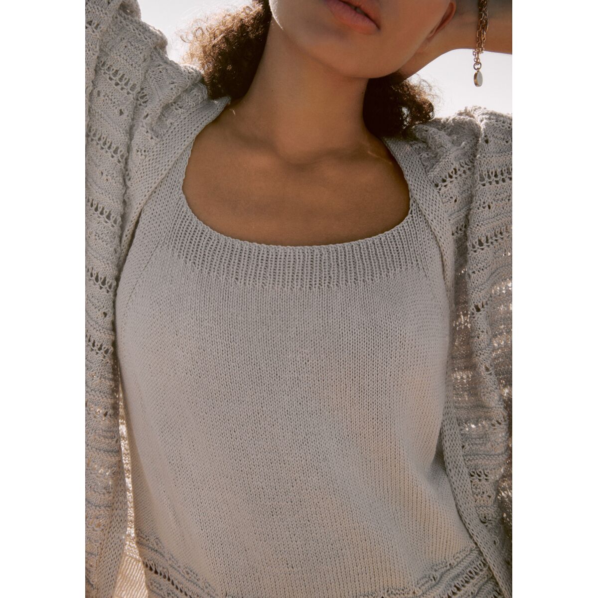 Dit dames topje kun je nu zelf breien met het Lana Grossa Cotton Wool breipakket. Door de samenstelling van het garen valt het topje lekker soepel en draagt het comfortabel. Door het eenvoudige ajour motief krijgt het damestopje net wat meer stijl. Het model sluit bovenaan mooi aan en kan hierdoor zowel mét als zónder een vest gedragen worden.