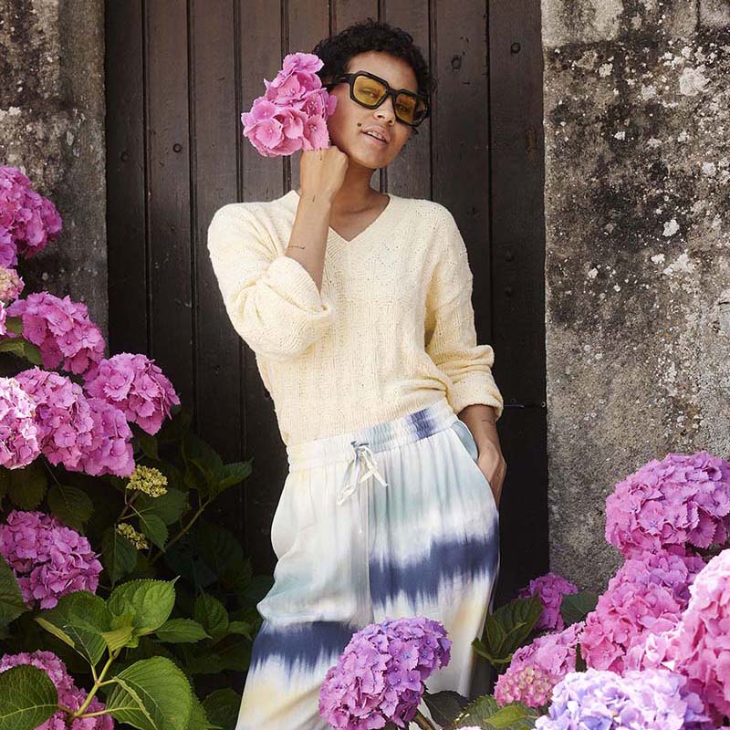 Deze leuke damestrui met V-hals is perfect voor de zomer. Je breit het met een kettingaren van katoen wat heerlijk soepel valt en leuk combineert met verschillende kledingstijlen. Door het ingebreide motiefje is het een afwisselend project. De zomerse damestrui is te breien is in de maten S-M, L en XL.