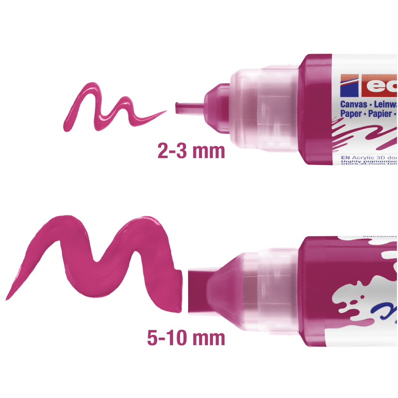 edding gaat door waar andere acrylmarkers stoppen. De edding Acrylmarker 5400 3D double liner is de nieuwste uitvinding. De tubevormige stift heeft twee mondstukken van verschillende grootte, 2-3 mm aan de ene en 5-10 mm aan de andere kant, en geeft je een unieke schilderervaring. De verf komt uit de tube door er alleen maar in te knijpen. Dankzij de twee spuitmonden van verschillende grootte, kan de verf in elke gewenste hoeveelheid aangebracht en gebruikt worden. Wordt de verf rechtstreeks aangebracht, geeft het jouw kunstwerk wat plasticiteit. Zo is het natuurlijk ook mogelijk om de verf met een kwast aan te brengen. Ontdek de kunstenaar in jezelf want de mogelijkheden zijn eindeloos!