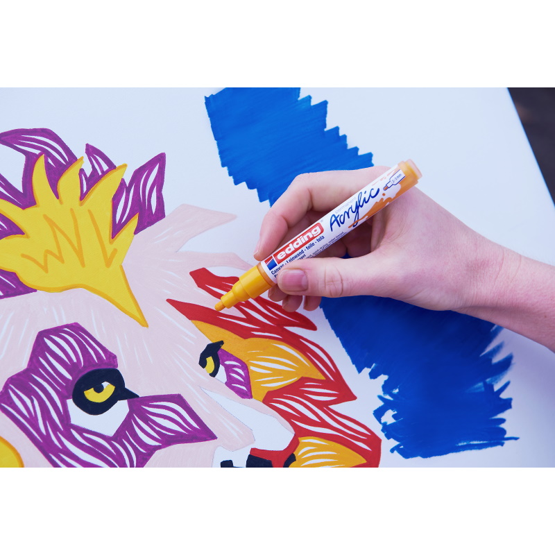 De helderheid en effecten zullen jou zeker inspireren! De Acrylmarkers zijn verkrijgbaar in drie verschillende dekkingsniveaus (dekkend, halfdekkend en transparant), waarmee uiteenlopende verftechnieken mogelijk zijn. Bovendien combineren de kleuren perfect met de edding 5200 permanent sprays en de andere acrylmarkers.