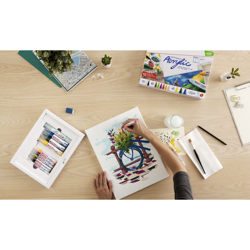 Ontdek de kunstenaar in jezelf en de mogelijkheden van de serie Acrylmarkers. Daarvoor heeft edding een prachtige set samengesteld die je zeker zal inspireren om jouw teken- en schilderkwaliteiten naar een hoger niveau te tillen. In de edding Acrylmarkers Creative set zitten 2 Acrylmarkers 5300 fijn, 6 Acrylmarkers 5100 meduim, 3 Acrylmarkers 5000 breed, 1 Acrylmarker 5400 3D double liner en een A4 schilderblok met 10 vellen hoogwaardig teken- en verfpapier met een canvas structuur, speciaal ontwikkelt voor het werken met Acrylmarkers.
