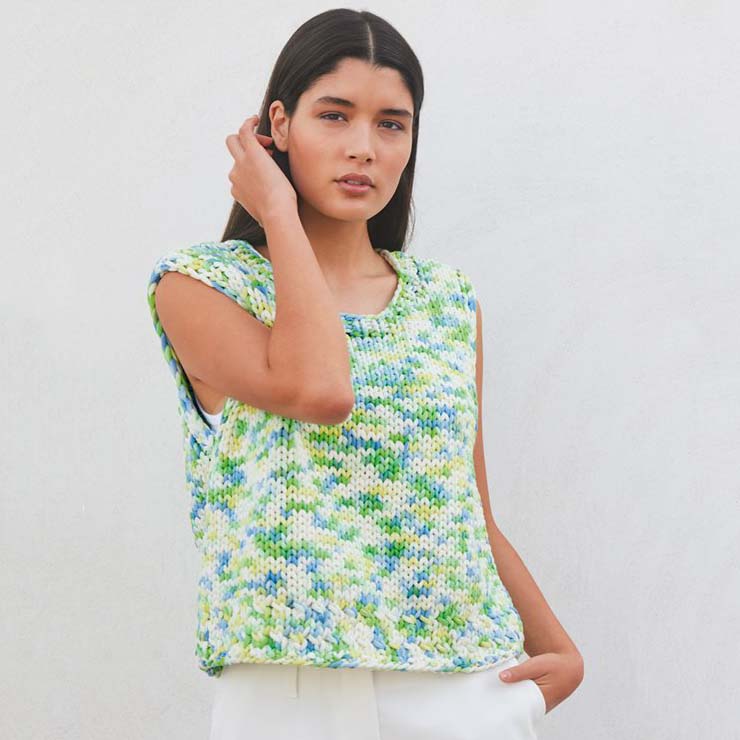 Dit gebreide topje voor dames is ook leuk als spencer te dragen over een blouse of shirt. De eenvoudige tricotsteek laat de combinatie van vrolijke kleuren mooi tot zijn recht komen. En het dikke, zachte buisgaren maakt dat je het topje in een paar dagen af hebt. Het zomerse topje is beschikbaar van maat 36 tot maat 44 en je kunt het in iedere gewenste kleur maken.