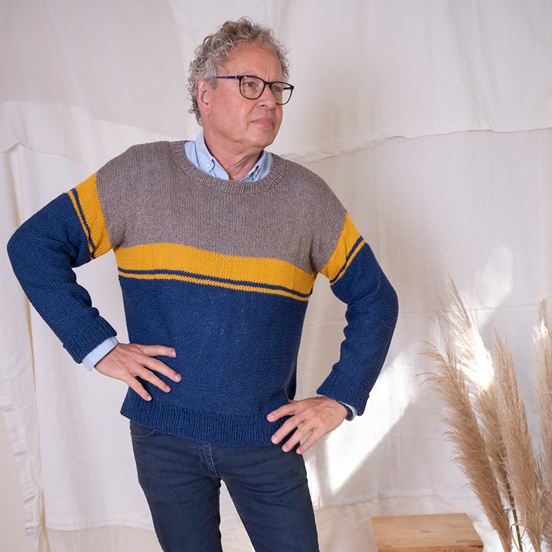 Deze gestreepte herentrui breien is heel makkelijk met het FairMade breipakket. De trui wordt in tricotsteek gebreid en met averechte tricotsteek. Door de vrolijke kleuren kun je de trui sjiek én casual dragen. Je breit de herentrui met het gerecyclede garen Borgo de Pazzi Amore Soft Cashmere.