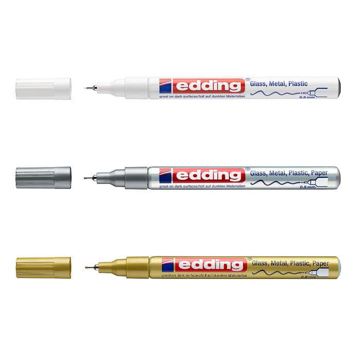 Deze set glanslak markers edding 780 bestaat uit stiften. 1x zilver, 1x goud en 1x wit. De edding 780 maker heeft een fijne punt zodat je er mooi gedetaileerd mee kan schrijfen en tekenen.