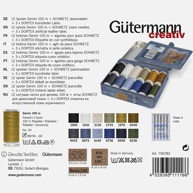 Complete Gütermann naaigaren set Denim-Box met naaigaren, naaimachinenaalden en labels. Deze Gütermann Naaigaren set Denim-Box is inclusief 12 klosjes Denim naaigaren in denim kleuren, 1 doosje Schmetz Jeans naaimachinenaalden en 3 kunstleren labels. Zó handig, deze complete Gütermann Naaigaren set Denim-Box, alles bij elkaar om jeansstoffen te naaien.